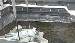 In March 2021, more than 500 cultural relics, including a 3,000-year-old gold mask, were discovered at Sanxingdui at a 4.6-square-mile area outside the provincial capital of Chengdu.[22][23] The mask is estimated to be made from 84% gold and weighs 280 grams (0.6 pounds). According to the National Cultural Heritage Administration, the items were recovered from six newly discovered "sacrificial pits".[23] Additional masks, jade tools, and ivory relics were also discovered in the pit.[24] The six pits were discovered at the Sanxingdui site between 2020 and 2022 during a renewed slate of excavations. The artifacts found in these excavations include fragments of a gold mask, traces of silk, bronze ware depicting animals, ivory carvings, and more. A round of excavations is scheduled to conclude in October 2022.[25][26][27][28]