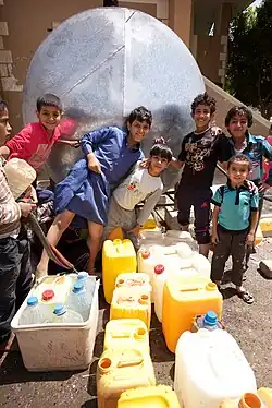In the city of Sanaa itself, there was a continuous expansion of tap water supply under the National Water and Sanitation Authority (NSWA) through the end of the 1990s, but it was outpaced by the city's growth. The public water supply only served 40–50% of Sanaa residents by 2000.[74] The percentage has decreased in recent years: in 2009, it was estimated that 55% of residents were connected to the public water supply; in 2018, only 43% did.[5] For residents without access to the municipal water network, the only option for drinking water is from tanker trucks, which is expensive.[33] Access to tap water is also inconsistent between neighborhoods, and even in places where there is public water, water pressure can be too low, resulting in unreliable access for some households.[74] Most households have access to water for less than one full day per week.[5] There are also problems with pipe leakage, with estimates ranging from 40% to 60% of water being lost due to leaks.[5]