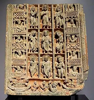 Stupa No. 2 was established later than the Great Stupa, but it is probably displaying the earliest architectural ornaments.[26] For the first time, clearly Buddhist themes are represented, particularly the four events in the life of the Buddha that are: the Nativity, the Enlightenment, the First Sermon and the Decease.[31]