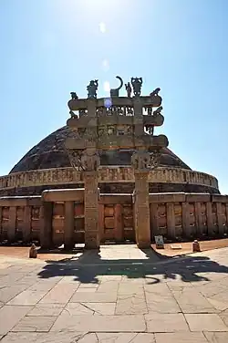 The Satavahana Empire under Satakarni II conquered eastern Malwa from the Shungas.[39] This gave the Satavahanas access to the Buddhist site of Sanchi, in which they are credited with the building of the decorated gateways around the original Mauryan Empire and Sunga stupas.[40] From the 1st century BCE, the highly decorated gateways were built. The balustrade and the gateways were also colored.[6] Later gateways/toranas are generally dated to the 1st century CE.[26]