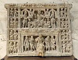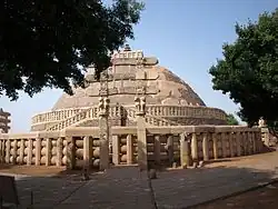 ![]() Stupa No. 2 Shunga period, but mason's marks in Kharoshti point to craftsmen from the north-west (region of Gandhara) for the earliest reliefs (circa 115 BCE).[27][28][23] |