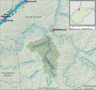 Sancho Creek is a tributary of Middle Island Creek, 9.6 miles (15.4 km) long,[3] in northwestern West Virginia in the United States. Via Middle Island Creek and the Ohio River, it is part of the watershed of the Mississippi River, draining an area of 22.2 square miles (57 km2)[4] in a rural region on the unglaciated portion of the Allegheny Plateau.
