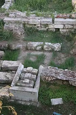 To the west of the altar in the Classical period was a platform made of poros blocks with marble steps on the east and south sides measuring 7.00 metres from north to south and over 7.70 metres from east to west (the western end was not uncovered in excavations).[20] It is possible that this was a fountain house similar to the Southwest and Southeast Fountain Houses in the Agora and the fountain house by the Dipylon Gate.[20] Stratigraphy of the neighbouring Panathenaic Way suggests that it was built in the late second or early first centuries BC.[21] The northeastern corner of this platform was covered over by the western edge of the porch of the early Roman temple.[20] This structure was destroyed at the end of the fourth century AD, as shown by pottery and coins, probably as a result of Alaric's sack of Athens in 396 AD.[21]
