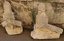 At some point in the Imperial period a bath complex was built to the north of the temple, which included a marble latrine, built into the space to the west of the temple, abutting directly on its western wall.[30] The cross-wall and east wall of the temple were demolished and rebuilt with rubble masonry atop a foundation of field stones early in the 3rd century AD.[31] The new east wall was 0.50 metres west of the earlier wall.[32]
