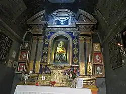 The sanctuary at Macereto supposedly was erected after a miracle. A wooden statue of the Madonna and Child (Madonna di Macereto) by an unknown master was being transported across the mountains as a gift from the Marca di Ancona to the Kingdom of Naples. On 12 August 1356, the animal that hauled the wagon with the statue halted here at Macereto, a spot the Madonna putatively chose.[7] This sweet and sentimental style of carving was popular in The Marche; similar statues exist in Castel Sant'Angelo, Caldarola, Visso, Preci, Camerino and Sarnarno. It is unclear if the sculptor derives from Umbria or Siena.