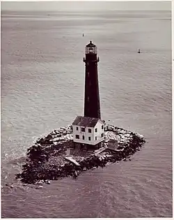 In December 2011, the construction of a new island was completed. 1,400,000 yards (1,300,000 m) of sand was dredged from the sea floor and deposited around the lighthouse creating a 2,600-foot (790 m) by 500-foot (150 m), or approximately 15-acre (6.1 ha), island.[9] Less than a year later the $6,000,000 restoration of the island was washed away by Hurricane Isaac.[10]