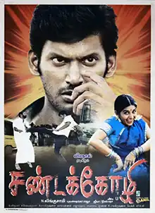 Sandakozhi (transl. Fighting Rooster) is a 2005 Indian Tamil-language action drama film directed by N. Linguswamy and produced by Vikram Krishna under G K Film Corporation. The film stars Vishal, Meera Jasmine, Rajkiran, and Lal, while Raja, Suman Setty and Ganja Karuppu play supporting roles. The music was composed by Yuvan Shankar Raja, while the cinematography and editing were handled by Jeeva-Nirav Shah and G. Sasikumar respectively.