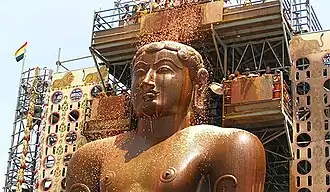 Sandalwood use is an integral part of the daily practices of Jainism. Sandalwood paste mixed with saffron is used to worship the Tirthankaras of Jainism. Sandalwood powder is showered as blessings by Jain monks and nuns (sadhus and sadhvis) onto their disciples and followers. Sandalwood garlands are used to dress the body during Jain cremation ceremonies. During the festival of Mahamastakabhisheka that is held once in every 12 years, the Gommateshwara statue is bathed and anointed with libations such as milk, sugarcane juice, and saffron paste, and sprinkled with powders of sandalwood, turmeric, and vermilion.[40]