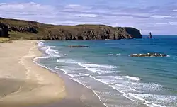 Sandwood Bay (Scottish Gaelic: Bàgh Seannabhad)[1] is a natural bay in Sutherland, on the far north-west coast of mainland Scotland. It is best known for its remote 1-mile-long (1.6 km) beach and Am Buachaille, a sea stack, and lies about 5 miles (8 kilometres) south of Cape Wrath. Behind the bay's large dunes, stretches the freshwater Sandwood Loch.