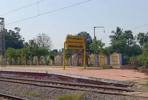 Sangam Jagarlamudi railway station (station code:SJL[1]) is an Indian Railway station, located in Sangam Jagarlamudi of Guntur district in Andhra Pradesh. It is situated on Guntur–Tenali section and is administered by Guntur railway division of South Central Railway zone.[2] It is classified as an E-category station in the division.[2]: 11 The station was re-constructed with two new platforms, as a part of doubling and electrification works on the Tenali–Guntur section, which was commissioned on 26 April 2019.[3] The station also has rail yard for freight trains.[4]