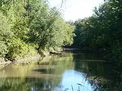 The upper Sangamon, between Mahomet and Monticello, runs along the face of a terminal moraine within the Lake Michigan Glacial Lobe, which ranges in age from 28,000 to 12,000 BP.[6] During the glacial Woodfordian Substage (middle Wisconsin Stage), ice of the Lake Michigan Glacial Lobe advanced rapidly, leaving a terminal moraine parallel to the modern Sangamon River.[6] The ice stagnated and melted behind this moraine, without the meltwater overtopping the terminal moraine. Along this stretch, the eastern part of the watershed of the Sangamon therefore consists of short creeks, two to three miles (3–5 km) in length, that drain the face of the moraine. This forms an asymmetric watershed typical of rivers formed along the face of a terminal moraine.