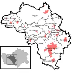On 1 October 2005 the Verwaltungsgemeinschaft Sangerhausen, consisting then of 10 municipalities was dissolved and turned into the single town/municipality Sangerhausen; which meant that the 9 villages were truly annexed. On the same date Breitenbach, Großleinungen and Wolfsberg also joined, coming from the municipal association Roßla-Südharz. On 1 December 2005 Riestedt followed, coming from the Verwaltungsgemeinschaft Allstedt-Kaltenborn.[4] Finally, Wippra was incorporated on 1 January 2008, coming from the Verwaltungsgemeinschaft Wipper-Eine.[5]