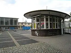 The present entrance building, which is located south of the railway tracks, was built in 1963. It was the first station to be built[4] in the GDR and is protected as a monument. The painter and graphic designer, Wilhelm Schmied created a particularly striking wall mosaic in the station's entrance hall. It shows the Mansfeld Land with its agriculture and mining. The round kiosk on the forecourt was built in 1957.