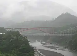 The Dahan River begins on Pintian Mountain in Hsinchu County, near the border of Shei-Pa National Park, at the confluence of Takekan Creek (Chinese: 大嵙崁溪) and the Baishi Creek (Chinese: 白石溪) near Jianshi town. The Takekan, the larger of the two is sometimes considered part of the main stem. It flows north through a narrow gorge and receives the major tributaries of Sanguang Creek (Chinese: 三光溪), Lala Creek (Chinese: 拉拉溪), and Xibuqiao Creek (Chinese: 西布喬溪) from the east.[1] At the Dongyanshan (East Eye Mountain) Recreation Area in Fuxing, it turns west and flows into Shihmen Reservoir, which is formed by the Shihmen Dam. Below the dam it flows northeast across Daxi District, then into the Sanxia District of New Taipei City, where it receives the Sanxia River (Chinese: 三峽溪). It continues to flow northeast across New Taipei City until its confluence with the Xindian River, which forms the Tamsui River.