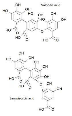 Sanguisorbic acid is a constituent of some ellagitannins. It is constituted by a hexahydroxydiphenic acid unit linked by an O-C bond to a gallic acid. The differences with its isomers, valoneic acid and nonahydroxytriphenic acid, are that the hydroxyl that links the hexahydroxydiphenoyl (HHDP) group to the galloyl group belongs to the galloyl group in valoneic acid, while in nonahydroxytriphenic acid, the hexahydroxydiphenic acid unit is linked by a C-C bond to gallic acid.