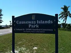 The causeway's islands were dredged from the San Carlos Bay when the original bridges were built. Since the completion of the current bridges, the islands have been operated as Causeway Islands Park by Lee County Parks and Recreation. The islands are referred to as Island A and Island B, and they serve as public beaches. Island B includes restroom facilities on each side of the road. The islands have always been a popular area among beachgoers for windsurfing and kitesurfing.