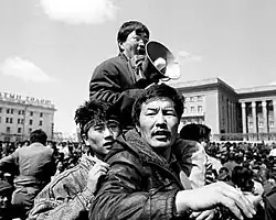 In 1989 and 1990, Zorig played a leading role in the events that led to Mongolia's adoption of a multi-party system. On 10 December 1989, a month after the fall of the Berlin Wall, Zorig led a group of 200 activists in a public protest demanding a free-market economy and free elections. In January 1990 Zorig and his fellow Mongolian Democrat dissidents began staging weekend protests in Sükhbaatar Square, the center of Ulaanbaatar. The protests started small but grew into large crowds as January passed into February. Tensions increased as the crowds swelled and the Communist government debated crushing them with force. At one point when protesters were scuffling with soldiers and an outbreak of violence seemed likely, Zorig took a megaphone, sat atop a friend's shoulders to make himself visible to the crowd, and called for calm. Violence was averted. The picture of Zorig addressing the protesters became a famous symbol of Mongolia's peaceful revolution.[5] In March, the Mongolian Politburo resigned and one-party rule in Mongolia ended.[6]