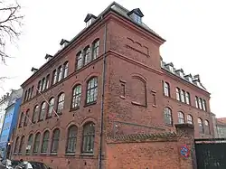 A new building for the school was inaugurated at Larslejsstræde 5 in 1899. The complex also comprised a new home for Skt. Petri kirkes, Thymes og P.s plejestiftelse, a home for elderly indigent, German expatriates. It had been established in the beginning of the 19th century through a merger of three independent institutions: Thymes Stiftelse ('Thyme's Foundation'), founded by Winand Thyme in 1775; Pelts Stiftelse ('Pelt's Foundation'), founded by Abraham Pelt in 1779; and a third one operated by the church.[2] Most of the residents were German expatriate women. In 1997, the building was sold to the school, which needed more space for its increasing number of students.[3]