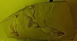 Pterosaur fossils have been recovered from the formation, including those of Mimodactylus[3] and Microtuban.[5] The pythonomorphs Pontosaurus, Eupodophis and probably Aphanizocnemus are known from the formation.[6] Insects are also known from compression fossils, including those of a dragonfly,[7] enigmatic pond-skater like insect Chresmoda.[8] and a mesoblattinid cockroach.[9] Compression fossils of angiosperm Sapindopsis are also known.[10] Numerous species of fossil fish are known,[11] including the ionoscopid Spathiurus dorsalis[12] and pycnodontid Flagellipinna rhomboides.[13] An incredible diversity of fossil pycnodonts of various, highly unusual body plans is known, in addition to the earliest representatives of modern fish groups such as acanthomorphs, African butterflyfish and eels.[1]
