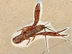 - ^ a b Nel, Andre; Azar, Dany; Martinez-Delclos, Xavier; Makhoul, Edouard (2004-03-25). "A new Upper Cretaceous species of Chresmoda from Lebanon - a latest representative of Chresmodidae (Insecta: Polyneoptera inc. sed.): first record of homeotic mutations in the fossil record of insects". European Journal of Entomology. 101 (1): 145–151. doi:10.14411/eje.2004.019.