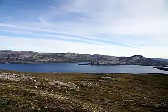 The 2x10 km[2] twin lake is separated from the Akuliarusiarsuup Kuua valley and Kangerlussuaq in the south by a low tundra ridge − part of the Kangaamiut dike swarm. To the east lies a sibling Aajuitsup Tasia lake, separated from Sanningasoq by a low marshland isthmus of little relief. To the north-east lies the 549 m (1,801 ft) Maniitsoq hill in the wide highland of Isunngua. The wide Tarajornitsut tundra highland lies to the west of the lake.