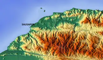 Sausapor has several zones which include rain forest, garden areas, beach, and forest margin.[7] Thirteen miles to the northeast of the settlement is Mar and the islands off its coast; Mios Soe Islands, Middleburg Island and Amsterdam Island.[6] The area around the village is heavily forested, with hilly areas to the southeast. The extensive stretch of beach in the area is known as the "Green Beach".[6] Entrance into Sansapor's jetty is through a narrow opening in the coral reef. The sea bottom, 40 feet (12 m) to 50 feet (15 m) below water, is visible from above.[10]