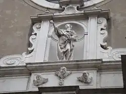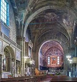 A church at the site was present by the 8th century, when the neighborhood was located outside the city walls, but after the 1184 fire destroyed the ancient church, it was reconstructed in the 15th-century in Gothic style.[1] Destruction by fire of this church was somewhat paradoxical, since Saint Agatha was the saint invoked for protection against fires. Further modifications were completed along the centuries, leading to a pastiche of styles. The incomplete 14th-century facade has a Renaissance architecture facade, decorated with Baroque statuary. Inside, the presbytery dates from the 15th century, the ceiling from the 16th century, the altars and fresco decoration from the 1680s, and the chapel of the Santissimo Sacramento is from the 18th century. The main altarpiece depicting Sant'Agata with Saints Peter, Paul, Lucia, Apollonia standing before the cross (1522) is a masterwork by Francesco Prata from Caravaggio.[2]