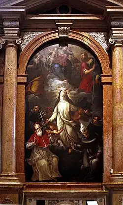 The main lunette has a representation of the Holy Trinity with the figures of St. Joseph and the Virgin Mary on either side. The Father is seated on a Gothic style throne with the crucifix between his knees and Christ at his side with a dove on his head. The figure is completed by a pair of angels above the Trinity. In the two smaller lunettes, the Bishop leads the people of Verona with the city's banner, and in the other, St. Peter the Martyr leads the friars with the black and white banner of the Dominicans.[31] These frescoes seem to be largely lost today, despite a not very successful retouching during the restoration of 1881;[32] the art historian Adolfo Venturi has recognized in these paintings the influence of the school of Stefano da Zevio, attributing them to some of his pupils.[33][34]