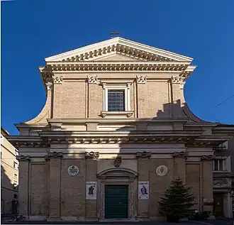 In 1604 the construction of the new church was begun, to the design of Gaspare Guerra. The project, halted eight years later, was revamped in 1653 by Francesco Borromini, who is responsible for the apse, the tambour of the cupola,[4] and the square campanile with four orders. After his death, the construction was continued by Mattia De Rossi. The late Renaissance-style façade, with two orders divided by pilasters, was completed in 1826, thanks to funds provided the Testament of Cardinal Ercole Consalvi.[5]