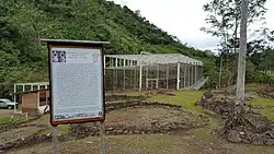 Carbon dated to 5,500 BP (3,500 BC), these discoveries belong to the early Formative Period in Ecuadorian chronology, and to the Archaic or Preceramic period of Peru.[4] A village with a central sunken plaza has been discovered. One of the two artificial platforms features a temple with a spiral configuration, and a ceremonial hearth, where a cache of greenstone offerings had been found.