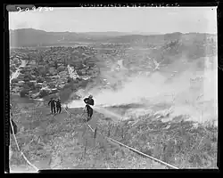 Firemen run up Mt. Washington hill to put down wildfire flames in Los Angeles, 1961 (Los Angeles Times Photographic Collection, UCLA Library)