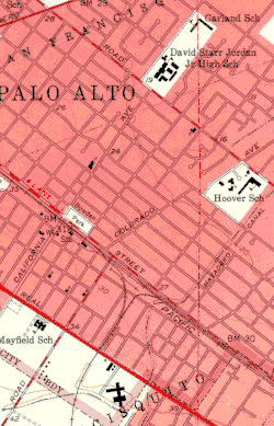 Animation of USGS maps of 1953, 1961, 1969, 1974, and 2015, showing the conversion of Oregon Avenue to Oregon Expressway, and its interchange with Alma Street and connection to Page Mill Road. In 1953, Oregon Avenue had a T intersection with Alma Street, while Page Mill Road and California Avenue had level crossings across the Southern Pacific railroad tracks. By 1961, the left-jog underpass connection between Page Mill Road and Oregon Avenue had been made, but Oregon was still a narrow residential street, which connected to US-101 so it became a very busy route to Stanford and the Stanford Industrial Park. By 1969, the Oregon Expressway had replaced about 90 homes on the south side of Oregon Avenue. By 1974, more ramps were added to the Alma Street interchange. At some point, by 2015, the railroad tracks behind the Sutter Packing Company cannery / Maximart / Fry's building were gone (where the 2015 map says "Mayfield"); this was the track that connected the Peninsular Railway route that ran along what became Foothill Expressway.
