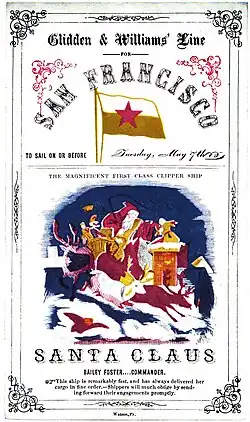 Santa Claus departed Boston on her maiden voyage on November 15, 1854, bound for Calcutta, India, returning to Boston on August 15, 1855, after a nine-month round trip.[1][2] Though considered a fast trip overall, her actual sailing times were unexceptional.[2] Clearing Boston in May 1856, the ship then made a 140-day trip to San Francisco, experiencing light winds throughout the voyage, apart from some heavy weather around Cape Horn, and arrived at her destination September 21.[2] From San Francisco, she traveled to Peru's Chincha Islands for a cargo of guano, which she duly delivered to Hampton Roads, Virginia.[2]