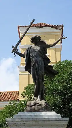 Mampo (or Mompoj) was the local indigenous chieftain (cacique) of the Malibu culture, when the Spanish conquistadors arrived, and Mompox means "land of the ruler Mampo". The city was founded on May 3, 1537, by Alonso de Heredia, brother of Pedro de Heredia, as a safe port on the Magdalena.[3] Santa Cruz de Mompox became quite prosperous as a port for the transportation of goods upriver into the interior. A royal mint was established here and the town was known for its goldsmiths. On August 6, 1810, it was the first town in Colombia to declare its independence from Spain[4] under the motto, "Be free or die" (Ser libres o morir). The flag of Mompox, which is red with a white cross in the center, dates back to this time in 1810.
