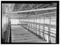 By far the largest building at the railyard is the erection and machine shop, which spans the full width of the site from Second to Commercial and contains about 165,000 square feet (15,300 m2) of floor space.[2] The building was designed in 1920 and built in eight months starting in February 1921. The erection shop and machine shop are within one building, separated by a wall on the south side of the erection shop. At the time it was considered to be at the forefront of industrial design, comparable to the Glass Plant at the Ford River Rouge Complex in Michigan.[1] The building has a steel structure, with uninterrupted glass curtain walls on the north and south faces and more substantial reinforced concrete facades on the east and west sides. The expansive main bay (erection shop) is 57 feet (17 m) high and 604 feet (184 m) long with several overhead cranes, the largest of which has a 250-ton capacity. The building is floored with wooden blocks to cut down on noise.