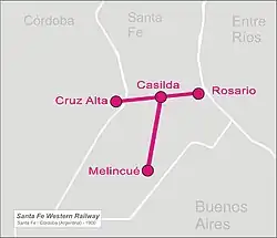 The Santa Fe Western Railway (SFW, native name: Ferrocarril Oeste Santafesino) was an Argentine railway company which became British-owned in 1900 when it was taken over by the Central Argentine Railway. The company was based in the south of the province of Santa Fe.