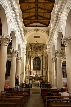 The church has five lateral altars (1741-1758) enriched by sculptures and intaglio by the Cultraro family. Among these, the altars of San Giuliano and of the Crucifix, the oldest, have some of the most elaborate decoration with garlands of flower and fruit. The altars of San Biagio and the Holy Family are more restrained. The altar of the presbytery houses the canvas depicting the Madonna dell'Idria, derived from the Greek Odigitria meaning the Our Lady of the Way. At the start of the right nave is the Chapel of the Addolorata completed in the 19th century.[1]