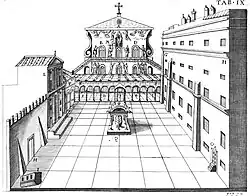 It seems that the church was built along with the tower.[1] The front of the church coincided with the external facade, which is to say, of its atrium.[1] Mariano Armellini notes that the doors of the church were made of bronze.[2]