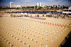 Arlington West was a temporary memorial created on Santa Monica Beach just north of the Santa Monica Pier at Santa Monica, every Sunday from sunrise to sunset. Crosses are placed on the beach for each U.S. military person who has died in the Iraq War. The number of crosses erected every Sunday now exceeds 4,000. For military personnel killed within the week past, flag draped coffins with blue crosses are positioned in front. The Arlington West Memorial, a project of Veterans For Peace, is intended to offer visitors a graceful, visually and emotionally powerful, place for reflection.[15]