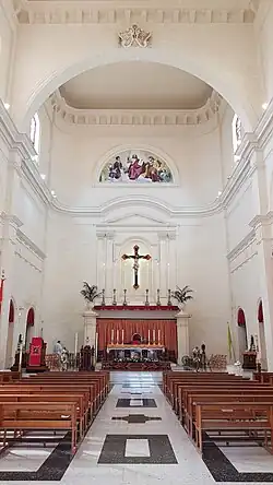 After Damato's death, the architect Louis A. Naudi was commissioned to continue works, and he was later joined by Godwin Aquilina. The original plan with five altars was deemed unsuitable due to the Second Vatican Council, so it was redesigned by Ġużeppi Galea. The foundation stone was laid on 6 October 1990.[1] Works progressed more rapidly, and the building was opened and blessed by Archbishop Joseph Mercieca on 17 July 2005.[2] The church is still incomplete, missing its bell towers,[1] and it is not yet consecrated.[5]