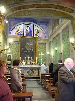 The single-roomed interior was entirely restored in the 19th century, and could be described as garish in places. The walls are painted to imitate green hanging curtains, with trompe-l'œil pilasters supporting an entablature with an inscription "Felix Nursiae tellus quae talem genuit alumnum" or "Happy land of Norcia, which gave birth to such a pupil". There is a painting of the patrons over the altar, and over that a lunette containing stained glass showing the Madonna and Child being venerated by saints.