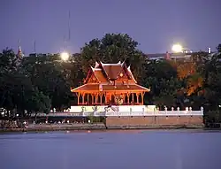 Of note in the park is the Santichaiprakarn Pavilion, built to commemorate King Bhumibol Adulyadej's (Rama IX) 60th birthday. The name of the park itself, also bestowed by King Bhumibol, means "the fortress of victory for peace", and was given in 1999, on the occasion of His Majesty's 72nd birthday, when Phra Sumen Fort and its surrounding grounds were developed into a public park. The royal pier and royal boat were created for traditional ceremonies along the Chao Phraya River. There is also a lamphu tree (Sonneratia caseolaris) in the park, which is in fact the source of the name of the surrounding district – Bang Lamphu. It is said to be the last one in Bangkok.[2][3]
