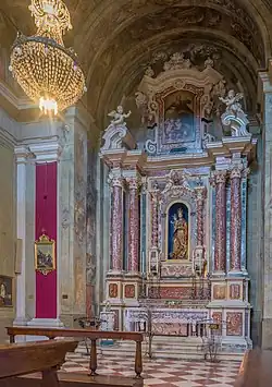 The dedication to Santa Maria in Silva rather than to Our Lady alone is in homage to the dedication the church had in its origins. The altar was built during the first half of the eighteenth century to replace the previous wooden one and completed in 1726.[58] It consists of a large scenic apparatus, extremely rich in details and decorative motifs, a typical feature of 18th-century Baroque. The material used is predominantly red breccia with white marble framing, which, together with the gilding and numerous inlays, provides an absolutely remarkable chromatic result.[101] The most important sculptural inserts of the altar can be assigned to the hand of Antonio Calegari, while the rest can be attributed to his workshop.[101]
