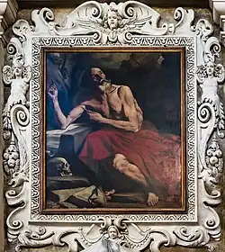 The paintings above the confessionals: in the side aisles, within elaborate stucco frames above the confessionals, hang four paintings depicting saints and holy men and women in penitential attitudes. On the right wall are St. Peter by Gian Giacomo Barbelli and St. Jerome by Andrea Terzi, while on the left are placed St. Mary Magdalene again by Barbelli and St. Mary of Egypt by Bernardino Gandino. The four canvases, all executed in the early seventeenth century, are evidently part of a common decorative project, commissioned to embellish the wall spaces above the confessionals.[116][117]