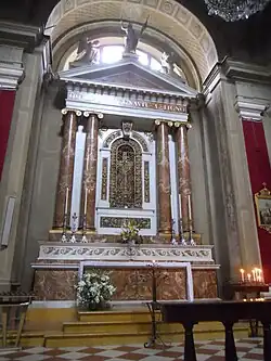 It was built in 1828, replacing the previous one, to accommodate a relic of the True Cross given to the parish in 1826. The author is unknown, and the attribution to Rodolfo Vantini is not supported by archival sources, although it is likely that the leading Brescian architect of the time was called for such an important role for an altar. The altar is set on lines markedly of neoclassical art, and the elegance of the composition, already remarkable for the alternation of pinkish breccia and white marble, is reinforced by the numerous gilded inserts that complement the high refinement of the colors. The center of the altarpiece is occupied by a niche where, enclosed by a grille, is kept the large crucifix-shaped reliquary containing the relic.[83]