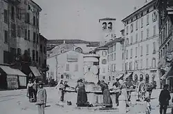 The church in a 1750 engraving by Francesco Battaglioli. The bell tower can be seen in its original form, the oratory of St. James lacking its neoclassical facade, the still uncovered Garza stream, and the old Discipline placed astride the latter, demolished in 1927. The view is to be considered enlarged: the clearing between the church and the Discipline, in front of the oratory, was actually narrower.