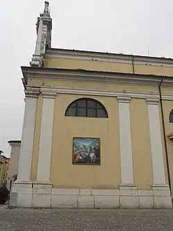 In 1831, the wooden compass of the side entrance was built by carpenter Giovanni Gozzoli, decorated with carvings and floral motifs. The artifact was then enriched with a yellow monochrome lunette by Giuseppe Teosa, depicting Jesus driving the merchants out of the temple.[62]