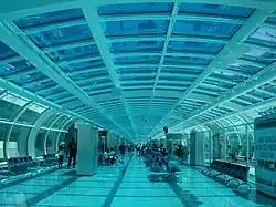 A highlight of the Santos Dumont Airport is the modern departure lounge, the first in the country to be completely covered with transparent material, which provides a wide view of the Guanabara Bay, where it is possible to see tourist attractions such as the Rio-Niterói Bridge, the Fiscal Island, the Museum of Contemporary Art, the city of Niterói, the Naval School and the Sugarloaf Mountain.[16]