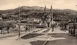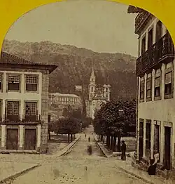 After the Count of Vila Pouca Theatre burned down on the night of 18 January 1841,[25] the Afonso Henriques Theatre was built to replace it in 1853 and was inaugurated two years later.[34] This new theatre, similarly to its predecessor, contributed in the completion of the church by donating the funds they received from plays and magic lantern slide shows.[25] On 22 April 1863, the play O Veterano Mateus, the song "O Sebastianista" and the comedy A Actriz were played exclusively to raise money for the construction of the church's bell towers. There were many in attendance and the city's music played outside the theatre.[35]