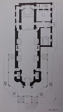 On a slightly recessed level, there are two slender bell towers topped by pyramidal corbels. It stands on a terrace, served by a staircase with several flights and a balustrade with pinnacles, flanked by pedestals with statues.[4]